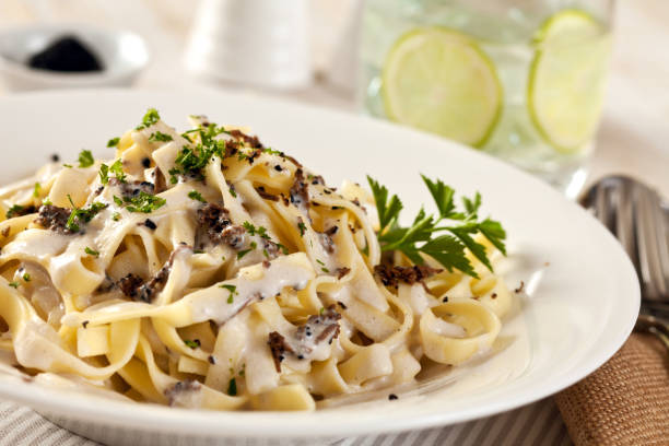 Silky fettuccine tossed in a rich Parmesan cream sauce, finished with aromatic black truffle oil and fresh herbs.
